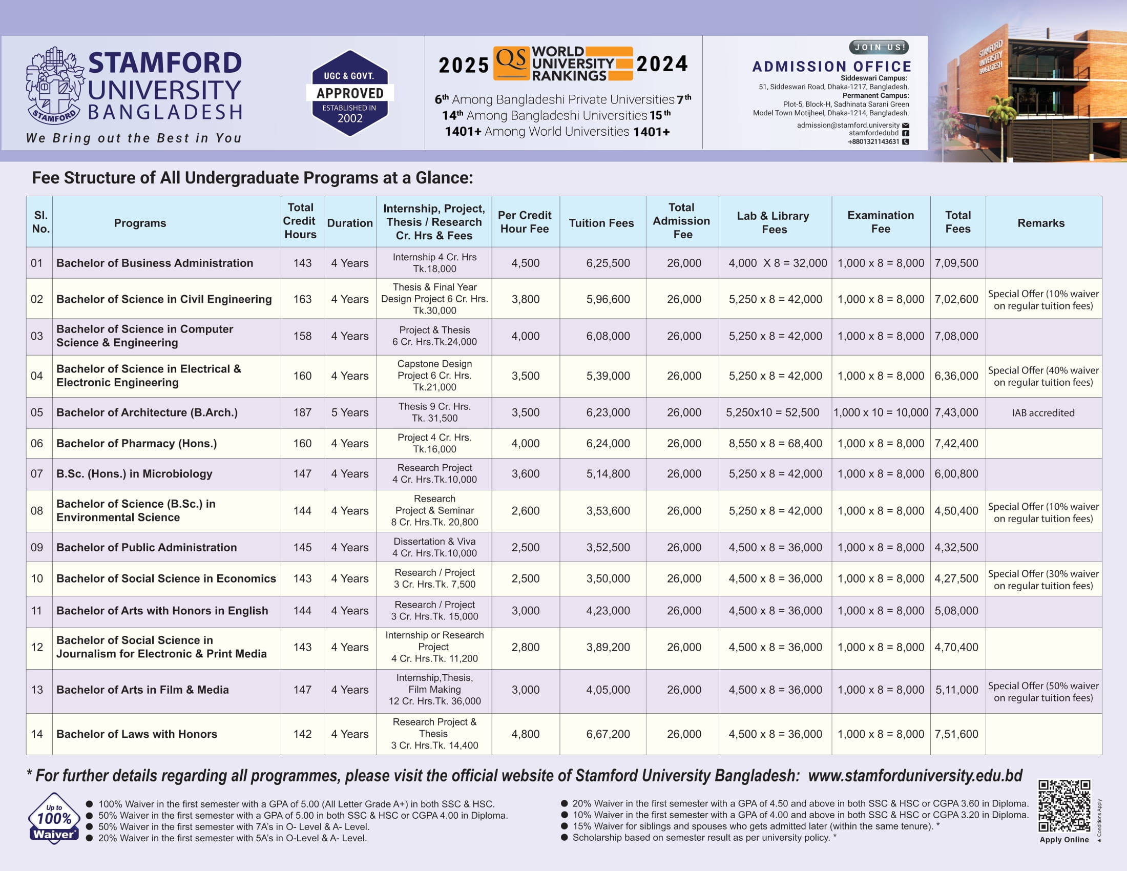 A student who wishes to get himself/herself admitted at Stamford will have to follow the following fees structure. Fees structure is subject to change without prior notice. It also may be mentioned that every student is to follow the fees structure under which he/she will be admitted and any change in fees structure will not affect his/her fees structure.