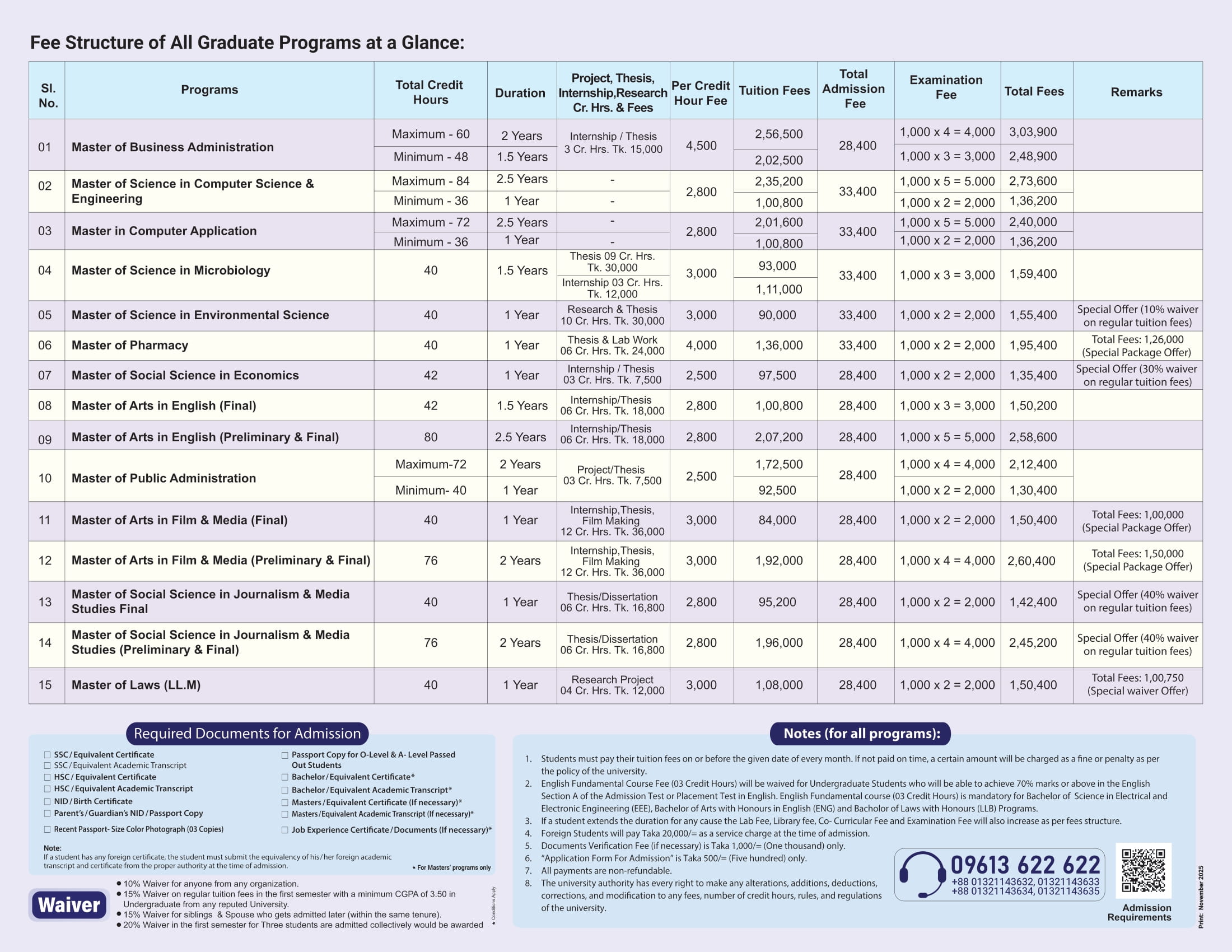 | # | Program | Total Credit Hour | Admission Fee | Per Credit Hour | Total Fees | Remakrs |